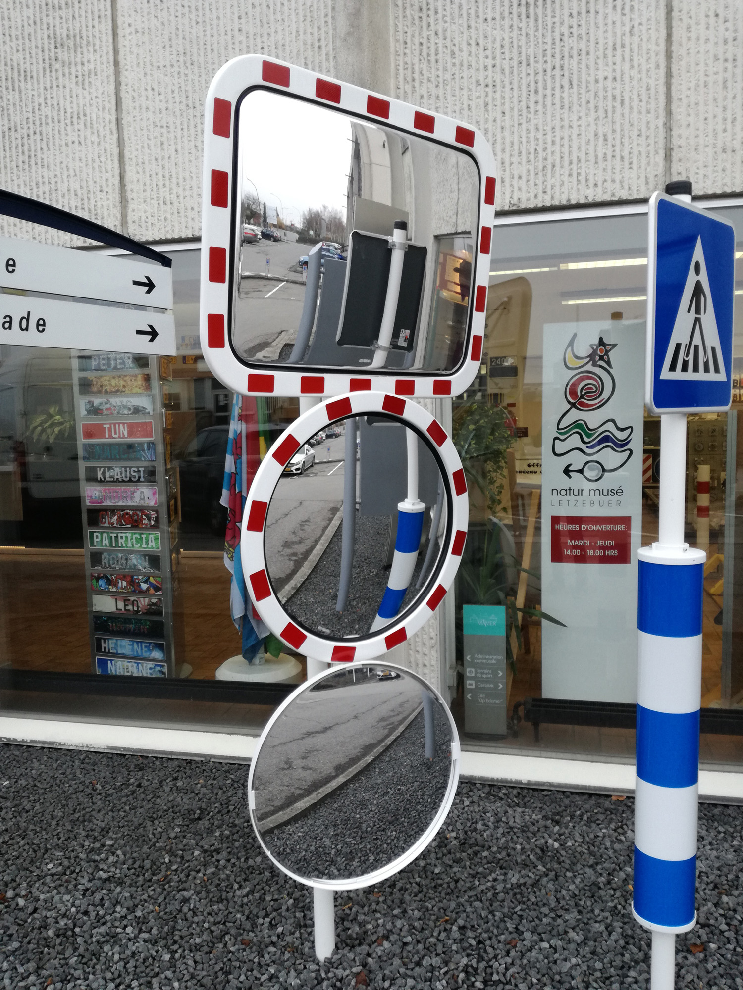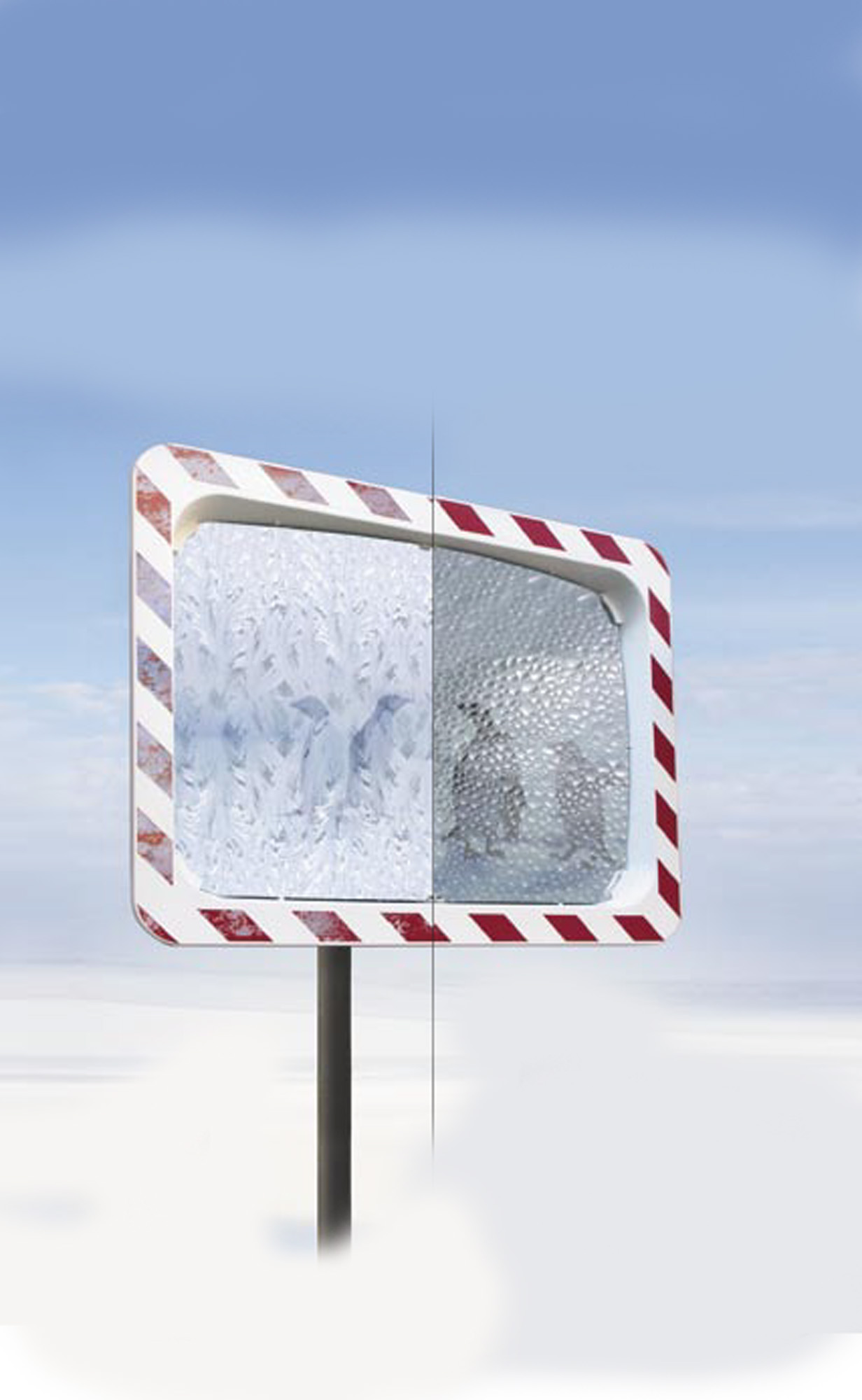 La plaque du miroir est fixée dans un cadre rouge et blanc solide. Les miroirs TM-F sont fournis avec un dispositif de fixation pour montage sur poteau de Ø 50 à 85 mm ou sur le mur.