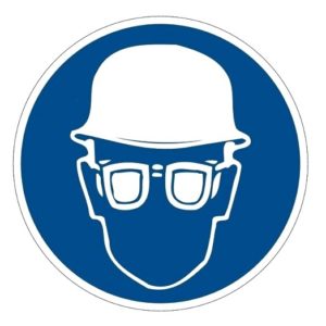 AUTOCOLLANT ROND 200 mm « CASQUE PROTECT. + LUNETTES OBLIGATOIRE »